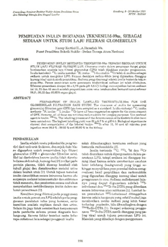 Clearance inulin dalam penetapan fungsi ginjal berdasarkan analisis laju filtrasi glomerulus (LEG) telah dijadikan standar pengukuran.Inulin karboksil- IC, inulin metoksi-%H, inulin- 1311 dan inulin-5 Cr telah diusulkan sebagaisediaan untuk mengukur LFG. Namun demikian radionuklida yang digunakan dianggapkurang ideal untuk studi penyidikan. Sediaan yang disenangi adalan inulin bertanda tekne-sium-99m. Proses pembuatan serta penetapan biodistribusi sediaan ini telah dilakukan.Efisiensi penandaan dicapai 85 = 5,7% pada pH 6,5.Uji biologi menunjukkan bahwa sediaanini 15, 30 dan 45 menit setelah penyuntiltan intra vena terakumulasi berturut-turut sebesar 98,9; 99,02 dan 99,92% organ ginjal.