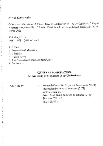 Aisyah Kotarumalos and Gusnelly (2005) Crises and migration: a case study of mollucans in the Netherlands. Lembaga Ilmu Pengetahuan Indonesia, Jakarta. ISBN 979-3688-10-6
