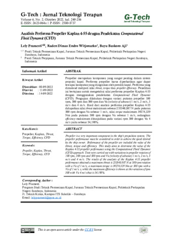 Lely, Pramesti and Raden, Dimas Endro Witjonarko and Bayu, Baskoro Aji (2022) Analisis performa propeller kaplan 4-55 dengan pendekatan Computational Fluid Dynamic (CFD). G-TECH : Jurnal Teknologi Terapan, 6 (2): 19. pp. 249-256. ISSN 2580-8737