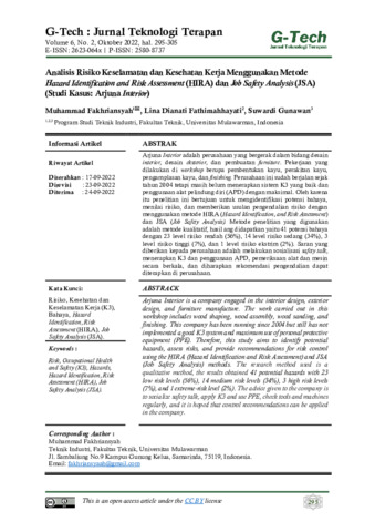 Muhammad, Fakhriansyah and Lina, Dianati Fathimahhayati and Suwardi, Gunawan (2022) Analisis risiko keselamatan dan kesehatan kerja menggunakan metode hazard identification and risk assessment (HIRA) dan job safety analysis (JSA) (studi kasus: Arjuna Interior). G-TECH: Jurnal Teknologi Terapan, 6 (2): 24. pp. 295-305. ISSN 2580-8737