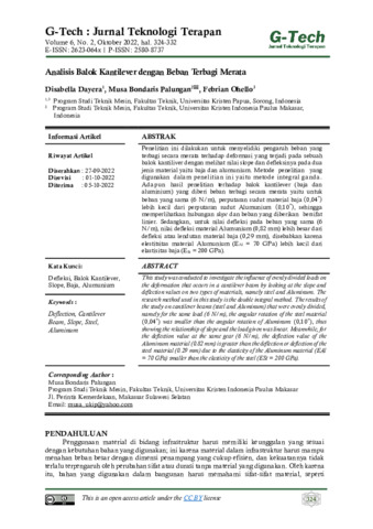Disabella, Dayera and Musa, Bondaris Palungan and Febrian, Ohello (2022) Analisa balok kantilever dengan beban terbagi merata. G-TECH: Jurnal Teknologi Terapan, 6 (2): 27. 324 -332. ISSN 2580-8737
