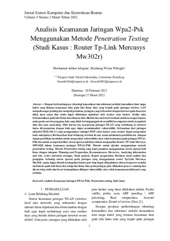 Mochamad, Adhari Adiguna and Bambang, Wisnu Widagdo (2022) Analisis keamanan jaringan WPA2-PSK menggunakan metode penetration testing (studi kasus: Router Tp-Link Mercusys Mw302r). Jurnal Sistem Komputer dan Kecerdasan Buatan (SISKOM-KB), 5 (2): 1. pp. 1-8. ISSN 2613-991X