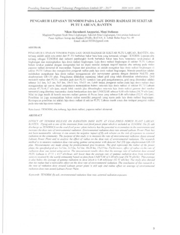 PENGARUH LEPASAN TENORM PADA LAJU DOSIS RADIASI Dl SEKITAR PLTU LABUAN, BANTEN. Abu terbang adalah salah satu emisi dari PL TU berbahan bakar batu bara yang termasuk sebagai TENORM. Lepasan abu terbang sebagai TENORM dari industri pembangkit listrik berbahan bakar batu bara berpotensi terakumulasi di lingkungan dan meningkatkan laju dosis radiasi lingkungan. Laju dosis radiasi lingkungan di sekitar PLTU Labuan belum terukur padahal dengan mengetahui hal ini dapat menilai dampak negatif lepasan abu terbang pada risiko