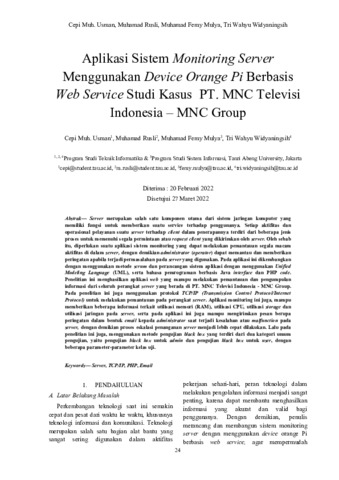 Server merupakan salah satu komponen utama dari sistem jaringan komputer yang memiliki fungsi untuk memberikan suatu service terhadap penggunanya. Setiap aktifitas dan operasional pelayanan suatu server terhadap client dalam penerapannya terdiri dari beberapa jenis proses untuk memenuhi segala permintaan atau request client yang dikirimkan oleh server. Oleh sebab itu, diperlukan suatu aplikasi sistem monitoring yang dapat melakukan pemantauan segala macam aktifitas di dalam server, dengan demikian administrator (operator) dapat memantau dan memberikan peringatan apabila terjadi permasalahan pada server yang digunakan. Pada aplikasi ini dikembangkan dengan menggunakan metode scrum dan perancangan sistem aplikasi dengan menggunakan Unified Modeling Language (UML), serta bahasa pemrograman berbasis Java interface dan PHP code. Penelitian ini menghasilkan aplikasi web yang mampu melakukan pemantauan dan pengumpulan informasi dari seluruh perangkat server yang berada di PT. MNC Televisi Indonesia - MNC Group. Pada penelitian ini juga menggunakan protokol TCP/IP (Transmission Control Protocol/Internet Protocol) untuk melakukan pemantauan pada perangkat server. Aplikasi monitoring ini juga, mampu memberikan beberapa informasi terkait utilisasi memori (RAM), utilisasi CPU, utilisasi storage dan utilisasi jaringan pada server, serta pada aplikasi ini juga mampu mengirimkan pesan berupa peringatan dalam bentuk email kepada administrator saat terjadi kesalahan atau malfunction pada server, dengan demikian proses eskalasi penanganan server menjadi lebih cepat dilakukan. Lalu pada penelitian ini juga, menggunakan metode pengujian black box yang terdiri dari dua kategori umum pengujian, yaitu pengujian black box untuk admin dan pengujian black box untuk user, dengan beberapa parameter-parameter kelas uji.