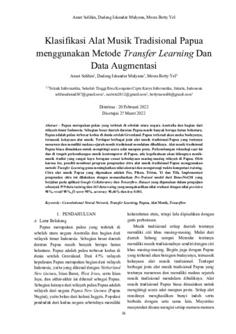 Papua merupakan sebuah pulau yang terletak di sebelah utara Australia dan merupakan bagian dari wilayah timur Indonesia yang sebagian besar daratannya masih berupa hutan belantara dan merupakan pulau terbesar kedua di dunia setelah Greenland. Papua terkenal akan aneka budayanya, termasuk kekayaan alat musik. Ada berbagai jenis alat musik tradisional Papua yang menawan dan memiliki sejarah musik tradisional mendalam dibaliknya. Alat musik ini biasa digunakan untuk mengiringi acara adat maupun pesta. Perkembangan teknologi saat ini dan di tengah perkembangan musik kontemporer di Papua, ada kegelisahaan akan hilangnya musik-musik tradisi yang sangat kaya beragam sesuai kebudayaan masing-masing wilayah di Papua. Oleh karena itu, peneliti membuat program pengenalan citra alat musik tradisional Papua menggunakan metode Transfer Learning, yang merupakan metode dari Convolutional Neural Network yang merupakan operasi konvolusi dengan melatih terlebih dahulu pada model sebelumnya yang kemudian menggabungkan beberapa lapisan pemrosesan, menggunakan beberapa elemen yang bergerak secara paralel dan terinspirasi oleh sistem saraf biologis. Citra alat musik Papua yang digunakan adalah Fue, Pikon, Triton, Yi dan Tifa. Implementasi pengenalan citra ini dilakukan dengan memanfaatkan Pre-Trained model dari DenseNet201 yang berjalan pada aplikasi Google Collaboratory dan Tensorflow. Dataset yang digunakan dalam pengujian sebanyak 979 data training dan 143 data testing yang mengahasilkan nilai evaluasi dengan nilai precision 98%, recall 98%, f1-score 98%, accuracy 98,46% dan loss 0.051.