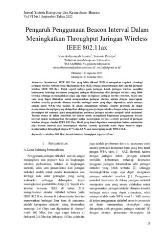 Vian, Ardiyansyah Saputro and Suwanto, Raharjo (2022) Pengaruh penggunaan beacon interval dalam meningkatkan throughput jaringan wireless IEEE 802.11ax. Jurnal Sistem Komputer dan Kecerdasan Buatan (SISKOM-KB), 6 (1): 5. pp. 29-36. ISSN 2613-991X