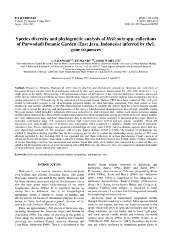 Heliconia L. is a single genus in the family Heliconiaceae, with approximate consists of 200 species. It has wide morphological variations among and within species which led to problems in species identification. Species diversity and phylogenetic analysis using morphology and rbcL marker subjected to 17 Heliconia spp. living collections of Purwodadi Botanic Garden (PBG) have been conducted. The rbcL gene located in chloroplast genome is one of appropriate proposed marker for plant barcoding assessment. This study aimed to study morphology and genetic variability of the PBG Heliconiaceae collections, to confirms the species name for a more accurate identity record and to reveal the diversity and phylogenetics of the species. Morphological characterization showed high variability among Heliconia species, which included 3 subgenera (Heliconia, Stenochlamys, and Griggsia) and 1 hybrid. Each species possessed unique morphological characteristics. The common morphological characters which distinguished among and within Heliconia species includes leaf form, inflorescence type, and bract characteristics. Key to the Heliconia species examined is presented in this paper. However, molecular confirmation using rbcL sequences showed high conservation level (0.932) and low genetic variability. About 656 nucleotides were monomorphic and 33 positions were polymorphic which comprised 18 singleton variable sites and 15 parsimony informative sites. Twelve haplotypes were produced with haplotype diversity value 0.8952. Pairwise distance analysis shows that they were shared high similarity of rbcL sequences with very low genetic distance (0.022 to 0.000). The topology of phylogenetic tree resulted by Neighbour-Joining algorithm has the best grouping and be able to explain the relationship among species of Heliconia, although supported by low bootstrap (65). It was separated into two clades following its subgen. classification. Clade 1 consists of subgen. Heliconia and Griggsia; while clade 2 consists of subgen. Heliconia and Stenochlamys; also hybrid species. Further, separation of deeper branchings (section) was inconsistent and unclear. Upon this study, rbcL marker was considered too conserved thus less valuable for phylogenetic analysis at lower taxa among and within Heliconia spp. However, rbcL was suggested to distinguish at higher level taxa between closely related genus and above.