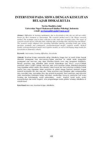 Novita, Maulidya Jalal (2022) Intervensi pada siswa dengan kesulitan belajar diskalkulia. J-PiMat : Jurnal Pendidikan Matematika, 4 (1): 5. pp. 466-474. ISSN 2684-7981