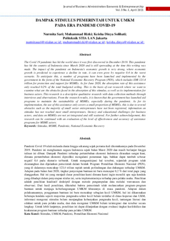 Nurmita, Sari and Muhammad, Rizki and Keisha, Dinya Solihati (2021) Dampak stimulus pemerintah untuk UMKM pada era pandemi Covid-19. Journal of Business Administration Economics and Entrepreneurship (JBEST), 3 (1): 1. pp. 1-8. ISSN 2721-1479