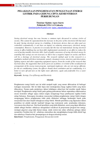 Tiominar, Sijabat and Agoes, Inarto (2021) Pelaksanaan penghematan penggunaan energi listrik pada Gedung Cipta Kementerian Perhubungan. Journal of Business Administration Economics and Entrepreneurship (JBEST), 3 (1): 5. pp. 38-43. ISSN 2721-1479