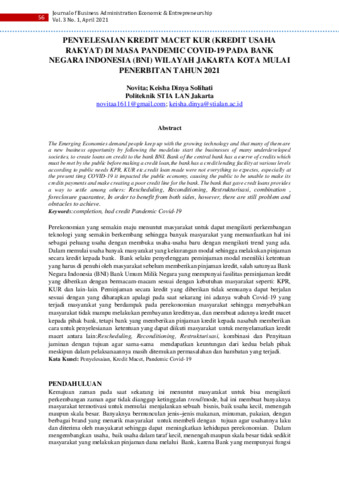 Novita, Novita and Keisha, Dinya Solihati (2021) Penyelesaian kredit macet KUR (Kredit Usaha Rakyat) di masa pandemic Covid-19 pada Bank Negara Indonesia (BNI) wilayah Jakarta Kota mulai penerbitan tahun 2021. Journal of Business Administration Economics and Entrepreneurship (JBEST), 3 (2): 1. pp. 56-62. ISSN 2721-1479