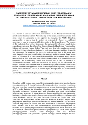 Sri, Rusmiati and Budi, Priyono (2021) Evaluasi pertanggungjawaban uang persediaan di bendahara pengeluaran pada kantor Ditjen Kekayaan Intelektual Kementerian Hukum dan HAM Jakarta. Journal of Business Administration Economics and Entrepreneurship (JBEST), 3 (2): 3. pp. 72-79. ISSN 2721-1479