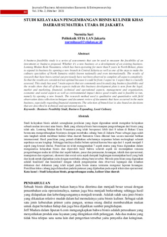 Nurmita, Sari (2021) Studi kelayakan pengembangan bisnis kuliner khas daerah Sumatera Utara di Jakarta. Journal of Business Administration Economics and Entrepreneurship (JBEST), 3 (2): 4. pp. 80-88. ISSN 2721-1479