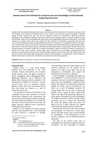 Trimanto, Trimanto and Setyawan, Agung Danarto and Siti, Nurfadilah Bawean Island: the potential for ecotourism and local knowledge on plant diversity supporting ecotourism. Journal of Indonesian Tourism and Development Studies, 4 (3). pp. 97-106. ISSN 2338-1647