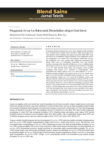 Muhammad, Fahri Ardiansyah and Tengku, Mohd Diansyah and Risko, Liza (2022) Penggunaan set top box bekas untuk dimanfaatkan sebagai cloud server. Blend Sains Jurnal Teknik, 1 (2). ISSN ISSN 2964-7347 (Online)