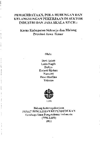 Devi Asiati and Laila Nagib and Daliyo and Eniarti Djohan and Nawawi and Dewi Harfina and Triyono (2011) Pemberdayaan, pola hubungan dan kelangsungan pekerjaan di sektor industri dan jasa skala kecil : Kasus kabupaten Sidoarjo dan Malang provinsi Jawa Timur. Project Report. Lembaga Ilmu Pengetahun Indonesia, Jakarta.