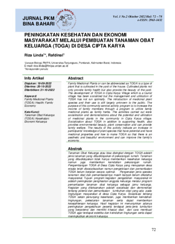 Riza, Linda and Rafdinal, Rafdinal (2022) Peningkatan kesehatan dan ekonomi masyarakat melalui pembuatan tanaman obat keluarga (TOGA) di Desa Cipta Karya. JURNAL PKM BINA BAHARI, 1 (2). pp. 72-78. ISSN 2963-1432
