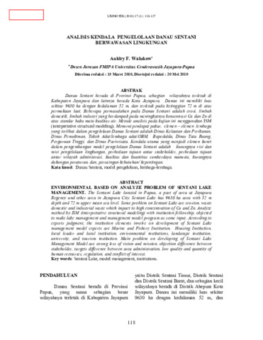Auldry, F. Walukow (2010) Analisis kendala pengelolaan Danau Sentani berwawasan lingkungan. Limnotek : Perairan Darat Tropis di Indonesia, 17 (1). pp. 118-127. ISSN 2549-8029