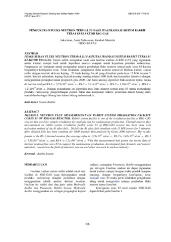 PENGUKURAN FLUKS NEUTRON TERMAL DI FASILITAS IRADIASI SISTEM RABBIT TERAS 83 REAKTOR RSG-GAS. Sistem rabbit merupakan salah satu fasilitas iradiasi di RSG-GAS yang digunakan untuk iradiasi sampel baik untuk keperluan analisis maupun untuk keperluan produksi radioisotop. Pengukuran ini bertujuan untuk mengetahui adanya perubahan fluks neutron termal pada teras 83 karena bergantinya konfigurasi teras. Telah dilakukan pengukuran fluks neutron termal di fasilitas iradiasi sistem rabbit dengan metode aktivasi keping. 20 buah keping Au-Al yang diiradiasi pada daya 15 MW selama 5 menit. Setelah peluruhan, keping dicacah masing-masing selama 1000 detik dan kemudian dianalisis dengan menggunakan perangkat lunak program Genie 2000. Dari hasil analisis diperoleh fluks neutron termal rerata di fasilitas iradiasi RS-1 = 3,23x1013 n/cm2.s., RS-2 = 3,41x1013 n/cm2.s., RS-3 = 1,18x1013 n/cm2.s., RS-4 = 1,21x1013 n/cm2.s. Dengan pengukuran ini diperoleh data fluks neutron termal teras 83 untuk mendukung produksi radioisotop, pengembangan elemen bakar dan komponen reaktor, penelitian dalam bidang sains materi dan berbagai litbang lain dalam bidang industri nuklir.