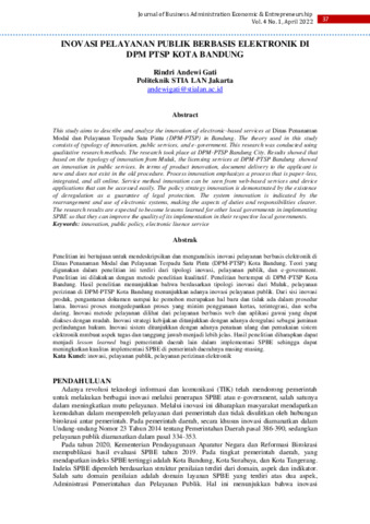 Rindri, Andewi Gati (2022) Inovasi pelayanan publik berbasis elektronik di DPM PTSP Kota Bandung. Journal of Business Administration Economics and Entrepreneurship (JBEST), 4 (1): 4. pp. 37-46. ISSN 2721-1479