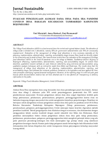 Umi, Murniati and Anna, Marinai and Zeni, Rusmawati (2021) Evaluasi pengelolaan alokasi dana desa pada era pandemi Covid-19 Desa Bakalan Kecamatan Tambakrejo Kabupaten Bojonegoro. Sustainable: Jurnal Akuntansi, 1 (1): 1. pp. 1-21. ISSN 2808-3482