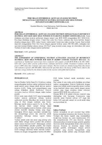 PERCOBAAN EPITHERMAL AKTIVASI ANALISIS NEUTRON MENGGUNAKAN REFERENCE MATERIAL BCR 063R SKIM MILK POWDER DI FASILITAS RABBIT SISTEM RSG-GAS. Telah dilakukan percobaan neutron epithermal dengan sampel susu BCR 063R menggunakan RS-3 RSG-GAS. Percobaan dilakukan dengan variasi 3 buah filter yaitu flexi boron, cadmium dan boron karbida. Sampel diiradiasi dengan daya 1 MW, waktu 3 menit, waktu tunda 5 menit dan waktu cacahan 3 menit. Hasil terbaik diperoleh menggunakan Filter flexi boron dengan paparan berkisar antara 200-300 mR/h, sedangkan dari spectrum memperlihatkan adanya energy 442,9 keV yang menurut acuan energy ini diemisikan oleh unsur Yodium (I) hasil reaksi dengan neutron epithermal.