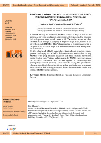 Nurlita, Novianti and Nadafajar, Nurmani’ah Widiarti (2021) Indigenous MSMEs financial management in Rejoso: empowerment issues towards a new era of financial inclusion. Journal of Interdisciplinary Socio Economic and Community Study, 1 (2): 4. pp. 55-62. ISSN 2809-753X