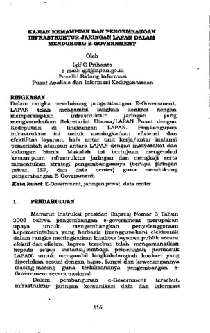 Igif G.Prihanto (2008) Kajian kemampuan dan pengembangan infrastruktur jaringan LAPAN dalam mendukung e-government. In: Teknologi informasi dan komunikasi. Massma Sikumbang, Jakarta, pp. 116-124. ISBN 978-8554-81-7