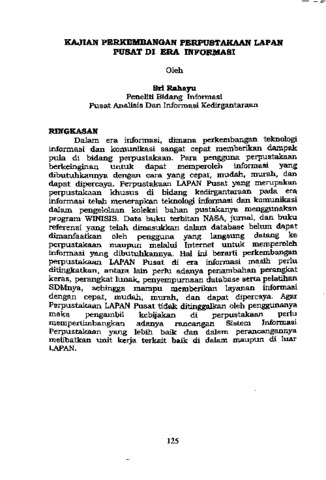 Dalam era informasi, dimana perkembangan teknologi informasi dan komunikasi sangat cepat memberikan dampak pula di bidang perpustakaan. Para pengguna perpustakaan berkeinginan untuk dapat memperoleh informasi yang dibutuhkannya dengan cara yang cepat, mudah, murah, dan dapat dipercaya. Perpustakaan LAPAN Pusat yang merupakan perpustakaan khusus di bidang kedirgantaraan pada era informasi telah menerapkan teknologi informasi dan komunikasi dalam pengelolaan koleksi bahan pustakanya menggunakan program WINISIS. Data buku terbitan NASA, jurnal, dan buku referensi yang telah dimasukkan dalam database belum dapat dimanfaatkan oleh pengguna yang langsung datang ke perpustakaan maupun melalui Internet untuk memperoleh informasi yang dibutuhkannya. Hal ini berarti perkembangan perpustakaan LAPAN Pusat di era informasi masih perlu ditingkatkan, antara lain perlu adanya penambahan perangkat keras, perangkat lunak, penyempurnaan database serta pelatihan SDMnya, sehingga mampu memberikan layanan informasi dengan cepat, mudah, murah, dan dapat dipercaya. Agar Perpustakaan LAPAN Pusat tidak ditinggalkan oleh penggunanya maka pengambil kebijakan di perpustakaan perlu mempertimbangkan adanya rancangan Sistem Informasi Perpustakaan yang lebih baik dan dalam perancangannya melibatkan unit kerja terkait baik di dalam maupun di luar LAPAN.