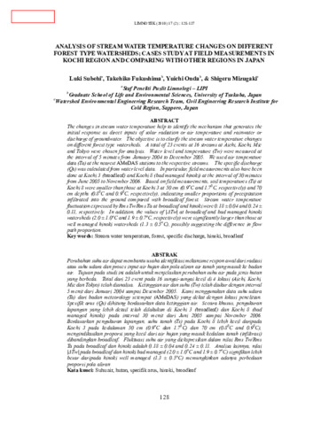 Luki, Subehi and Takehiko, Fukushima and Yuichi, Onda and Shigeru, Mizugaki (2010) Analysis of stream water temperature changes on different forest type watersheds; cases study at field measurements in kochi region and comparing with other regions in Japan. Limnotek : Perairan Darat Tropis di Indonesia, 17 (2). pp. 128-137. ISSN 2549-8029