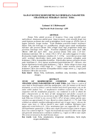Danau Toba adalah perairan di Sumatera Utara yang memiliki peran multisektoral, diantaranya adalah pusat kepariwisataan,selain memiliki fungsi lain untuk kegiatan perikanan dan untuk Pembangkitan Listrik Tenaga Air (PLTA) yaitu di bagian outletnya, Sungai Asahan.Telah dilakukan penelitian kondisi morfometri Danau Toba dan beberapa ciri stratifikasinya, dengan tujuan untuk mendapatkan informasi sifat perairan Danau Toba sebagai dasar bagi pengelolaan danau dan penelitian limnologis lebih lanjut. Penelitian dilakukan pada bulan April 2009, Oktober 2009 dan April 2010. Luas perairan Danau Toba yaitu 1.124 Km2, kedalaman maksimum 508 m, volume 256,2 x 109 m3, dan waktu tinggal air 81 tahun. Berdasarkan tingkat kedalaman relatifnya (Zr = 1,34%), mencirikan perairan tidak stabil, meskipun diperkirakan hanya pada lapisan permukaan sedangkan pada kedalaman >100 m menunjukkan kestabilan. Diperkirakan lapisan epilimnion berada pada kedalaman 0 – 30 m, lapisan metalimnion pada kedalaman 30 – 100 meter, dan lapisan hipolimnion berada pada kedalaman > 100 m. Kadar oksigen terlarut yang terukur di permukaan relatif tinggi (6 – 7 mg/l), namun menurun drastis pada kedalaman 100 m dan umumnya menunjukkan kondisi sangat minim (< 2 mg/l) pada kedalaman 200 m dan seterusnya.