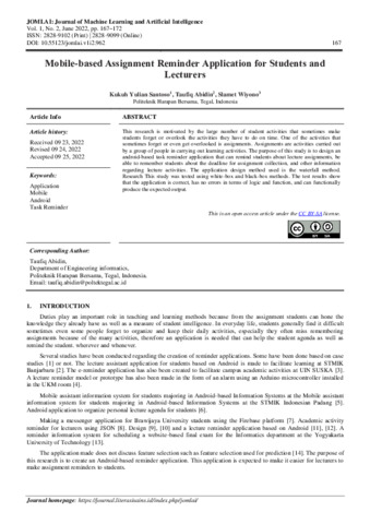 Kukuh, Yulian Santoso and Taufiq, Abidin and Slamet, Wiyono (2022) Mobile-based assignment reminder application for students and lecturers. Journal of Machine Learning and Artificial Intelligence, 1 (2): 8. pp. 167-172. ISSN 2828-9102