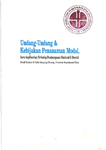 Azis, Suganda and Pauline, R.H. and Laksono, Laksono and Yeni, Saptia (2006) Undang-Undang & kebijakan penanaman modal, serta implikasinya terhadap pembangunan nasional & daerah: studi kasus di Kota Tanjung Pinang, Provinsi Kepulauan Riau. LIPI Press, Jakarta. ISBN 979-26-2487-2