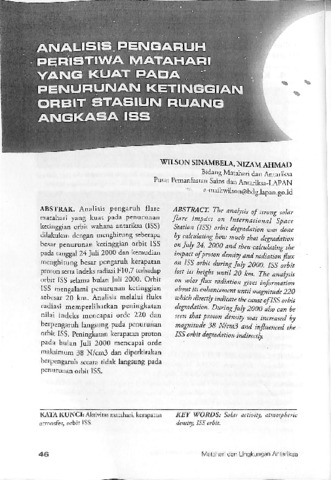 Analisis pengaruh flare matahari yang kuat pada penurunan ketinggian orbit wahana antariksa (ISS) dilakukan dengan menghitung seberapa besar penurunan ketinggian orbit ISS pada tanggal 24 Juli 2000 dan kemudian menghitung besar pengaruh kerapatan proton serta indeks radiasi F 10,7 terhadap orbit ISS selarna bulan Juli 2000. Orbit ISS mengalami penurunan ketinggian sebesar 20 km. Analisis melalui fluks radiasi memperlihatkan peningkatan nilai indeks mencapai orde 220 dan berpengaruh langsung pada penurunan orbit ISS. Peningkatan kerapatan proton pada bulan Juli 2000 mencapai orde maksimum 38 N/cm3 dan diperkirakan berpengaruh secara tidak langsung pada penurunan orbit ISS.