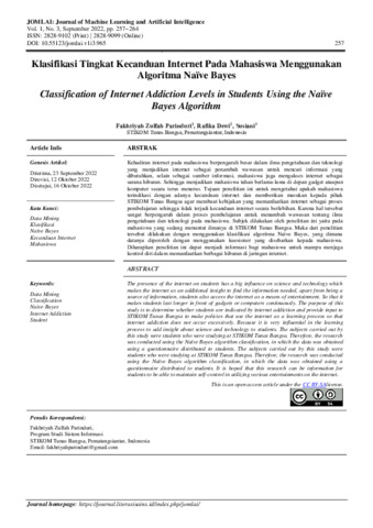 Fakhriyah, Zulfah Parinduri and Rafika, Dewi and Susiani, Susiani (2022) Klasifikasi tingkat kecanduan internet pada mahasiswa menggunakan algoritma Naïve Bayes. Journal of Machine Learning and Artificial Intelligence, 1 (3): 10. pp. 257-264. ISSN 2828-9102