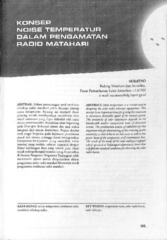 Dalam perancangan awal peralatan teleskop radio matahari perlu ditinjau konsep noise temperatur. Konsep ini menjadi dasar penting untuk mendapatkan sensitivitas atau sinyal minimum yang dapat dideteksi oleh suatu sistem penerima radio. Sensitivitas akan tergantung pada lebar pita frekuensi sistem dan atau waktu integrasi dari sistem deteksinya. Bagian deteksi awal sangat berperan pada kepekaan penerimaan sinyal dari sistem, sehingga hams menggunakan komponen-komponen yang memiliki noise internal yang rendah, saluran transmisi dengan faktor kehilangan daya yang rendah pula. Hasil telaah radiospektrograf matahari yang dioperasikan di Stasiun Pengamat Dirgantara Tanjungsari telah memenuhi syarat untuk dioperasikan dalam pengamatan noise radio matahari khususnya untuk pengamatan semburan radio matahari.