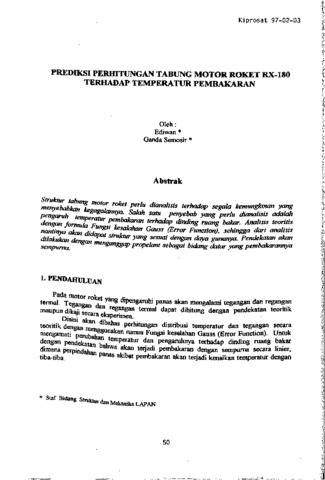 Strulaur tabung motor roket perlu dicmalisis terhadap segala Icemungkinan yang menyebabkan kegagalannya. Salah satu penyebab yang perlu dianalisis adalah pengaruh temperature pembakaran terhadap dinding ruang bakar. Analisis teoritis dengan formula Fungsi kesalahan Gauss (Error Function), sehingga dari analisis nantinya akan didapat struktur yang sesuai dengan Jaya gunanya. Pendekatan akan dilakukan dengan mengcmggap propelant sebagai bidang datar yang pembakarannya sempurna