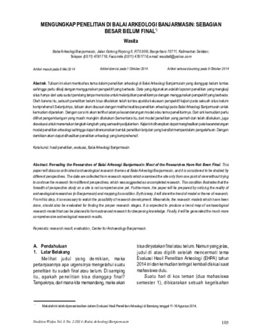 Wasita Wasita (2014) Mengungkap penelitian di Balai Arkeologi Banjarmasin: sebagian besar belum final. Naditira Widya, 8 (2): 2. pp. 105-126. ISSN 1410 - 0932