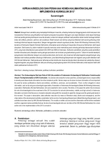 Sebagai insan cendekia yang mempelajari kehidupan masa lalu, arkeolog mempunyai tanggung jawab untuk menyusun dan menyebarkan informasi yang dihasilkan dari kajiannya kepada masyarakat. Beragam cara dapat dilakukan untuk dapat membagi informasi penting tentang kehidupan masa lalu tersebut, antara lain dengan publikasi hasil penelitian dalam bentuk berbagai terbitan (buku dan artikel), pameran, seminar, dan sosialisasi. Masih banyak cara lainnya yang bisa dilakukan oleh seorang arkeolog untuk membagi informasi kepada masyarakat. Dengan menggunakan sebuah organisasi profesi, Ikatan Ahli Arkeologi Indonesia (IAAI), terutama di Komisariat Daerah (Komda) Kalimantan, diharapkan peran arkeolog di masyarakat, khususnya Kalimantan, lebih dapat dirasakan. Oleh karena itu, dalam makalah ini penulis mencoba untuk membahas peran arkeolog terhadap keberadaan kurikulum 2013, yang mulai diberlakukan pada sekolah (SD, SMP, dan SMA) di Indonesia. Kurikulum pendidikan yang fokus pada pendidikan karakter dirasakan perlu diterapkan seiring dengan perubahan dan tuntutan yang berkembang saat ini. Tulisan ini bersifat deskriptif, pengumpulan data dilakukan dengan cara studi pustaka (buku dan koran), dan observasi terhadap kegiatan pengembangan yang dilakukan oleh institusi penelitian arkeologi di Kalimantan, yaitu Balai Arkeologi Banjarmasin dan kegiatan yang sudah dilakukan oleh IAAI Komda Kalimantan. Hasil penelusuran terhadap sumber tertulis dan observasi tersebut akan dievaluasi dan selanjutnya disusun kegiatan-kegiatan yang dapat dilakukan oleh para arkeolog yang tergabung dalam IAAI (Komda Kalimantan) untuk berperan lebih aktif dalam pelaksanaan kurikulum 2013.