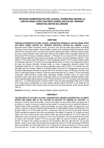 PENGARUH KONSENTRASI POLIVINIL ALKOHOL, KONSENTRASI URANIUM, pH LARUTAN URANIL NITRAT DAN WAKTU AGEING LARUTAN SOL TERHADAP VISKOSITAS LARUTAN SOL URANIUM. Pengaruh konsentrasi polivinil alkohol, konsentrasi uranium, pH larutan uranil nitrat dan waktu ageing larutan sol terhadap viskositas sol uranium telah dipelajari. Tujuan penelitian ini adalah untuk mempelajari pengaruh konsentrasi Polivinil alkohol (PVA), konsentrasi uranium, pH larutan uranil nitrat dan waktu ageing larutan sol terhadap viskositas larutan sol uranium pada pembuatan umpan proses gelasi eksternal serta pengaruh waktu pengeringan butiran gel UO3.