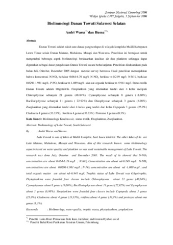 Andri, Warsa and Husna, Husna (2006) Biolimnologi Danau Towuti Sulawesi Selatan. In: Prosiding Seminar Nasional Limnologi III, 5 September 2006, Widya Graha LIPI Jakarta.