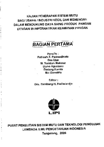 Fatimah Z. Padmadinata and Des Elza and Mohamad Tomtom Makmur and Djoko Agustono and Dadang Kurnia and Mai Damairia (2006) Kajian penerapan sistem mutu bagi usaha/ industri kecil dan menengah dalam mendukung daya saing produk pangan dengan memperhatikan keamanan pangan (Bagian pertama). 1 ed. LIPI Press, Tangerang. ISBN 979-3688-48-3