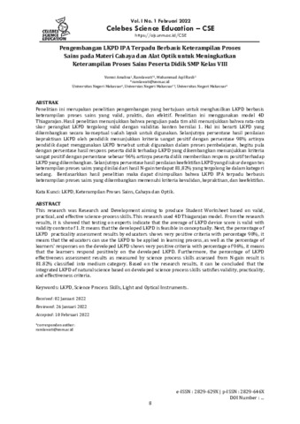 Yumni, Amalina and Ramlawati, Ramlawati and Muhammad, Aqil Rusli (2022) Pengembangan LKPD IPA terpadu berbasis keterampilan proses sains pada materi cahaya dan alat optik untuk meningkatkan keterampilan proses sains peserta didik SMP kelas VIII. Celebes Science Education, 1 (1): 2. pp. 8-16. ISSN 2829-646X
