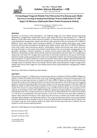 Nurfahmi, Hamka and Ramlawati, Ramlawati and Sitti, Rahma Yunus (2022) Perbandingan pengaruh metode peta pikiran dan peta konsep pada model discovery learning terhadap hasil belajar peserta didik kelas VII SMP Negeri 18 Makassar (studi pada materi pokok pemanasan global). Celebes Science Education, 1 (1): 5. pp. 31-37. ISSN 2829-646X