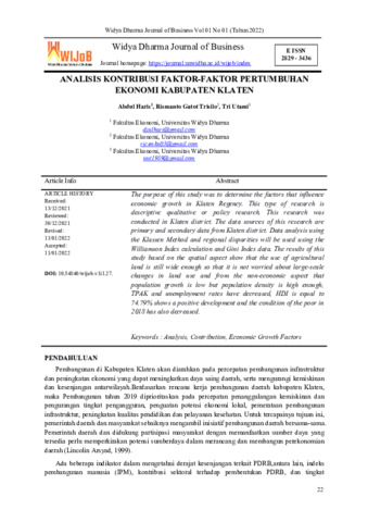Abdul Haris and Rismanto Gatot Trisilo and Tri Utami (2022) Analisis kontribusi faktor-faktor pertumbuhan ekonomi Kabupaten Klaten. Widya Dharma Journal of Business, 1 (1): 3. pp. 22-34. ISSN 2829-3436
