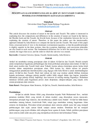 Muhafizah (2021) Penciptaan alam semesta dalam Al-Qur’An dan Tanakh (Yahudi) : pendekatan intertekstualitas Julia Kristeva. Mafatih: Jurnal Ilmu Al-Qur'an dan Tafsir, 1 (2): 3. pp. 29-42. ISSN 2829-4092