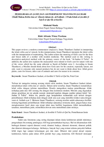 Minhatul Maula and Rizki Afrianto Wisnu Wardana (2021) Pemeliharaan janin dan asi perspektif Thanthawi Jauhari (studi makna Robba dan al-‘Alamīn dalam Qs. Al-Fatihah: 2 pada kitab Al-Jawahir fi Tafsir al-Qur’an Al-Karim). Mafatih: Jurnal Ilmu Al-Qur'an dan Tafsir, 1 (2): 5. pp. 7-9. ISSN 2829-4092