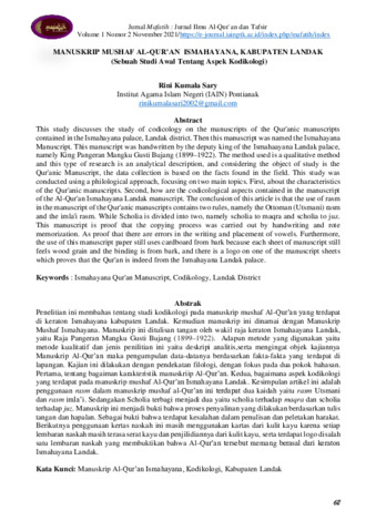 | Uncontrolled Keywords: | Manuskrip Al-Qur’an Ismahayana, Kodikologi, Kabupaten Landak |