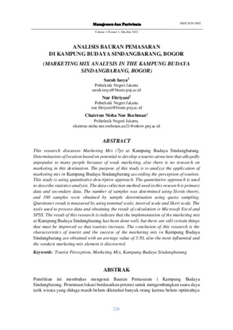 Sarah Iasya and Nur Fitriyani and Chairrun Nisha Nur Rochman (2022) Analisis bauran pemasaran di Kampung Budaya Sindangbarang, Bogor. Manajemen dan Pariwisata, 1 (2): 6. pp. 224-235. ISSN 2829-5692