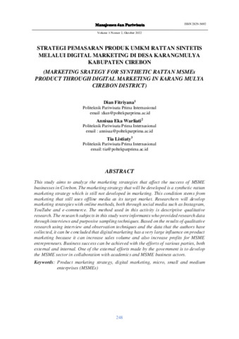 Dian Fitriyana and Annisaa Eka Warliati and Tia Listiaty (2022) Strategi pemasaran produk UMKM Rattan Sintetis melalui digital marketing di Desa Karangmulya Kabupaten Cirebon. Manajemen dan Pariwisata, 1 (2): 8. pp. 248-259. ISSN 2829-5692